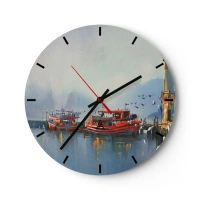 Falióra, Óra - Egy kikötő piros hajókkal a nyugodt vízen reggel - 30x30cm - A világ végén - Modern fali dekoráció nappalihoz, konyhához és hálószobához ARTTOR