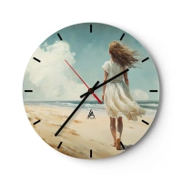 Falióra, Óra - Egy fehér ruhás nő mezítláb sétál a tengerparton - 30x30cm - Találkozás a nappal és a széllel - Modern fali dekoráció nappalihoz, konyhához és hálószobához ARTTOR