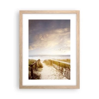 Poszter fehér keretben - Ösvény a tengerpartra naplementekor, madarak repülnek el mellettünk - 50x70cm - A béke tere - Modern fali dekoráció nappalihoz és hálószobához ARTTOR