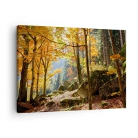 Vászonkép - Egy őszi erdő, tele aranyló levelekkel és napfénnyel - 70x50cm - Itt az ideje a pihenésnek - Modern fali dekoráció nappalihoz és hálószobához ARTTOR
