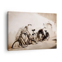Vászonkép - Két bicikli egy régi retró stílusú falnak dőlve - 70x50cm - A múlt felejthetetlen varázsa - Modern fali dekoráció nappalihoz és hálószobához ARTTOR