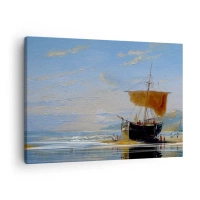Vászonkép - Egy hajó a tengerparton egy napsütéses napon - 70x50cm - Víz, föld, levegő - Modern fali dekoráció nappalihoz és hálószobához ARTTOR