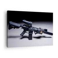 Vászonkép - Egy modern puska fekete színben, sötét háttér előtt - 70x50cm - Sötét lovag - Modern fali dekoráció nappalihoz és hálószobához ARTTOR