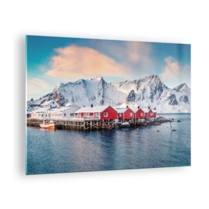 Üveg kép - Piros halászházak a fjordon, hegyekkel a háttérben - 70x50cm - Északi zug - Modern fali dekoráció nappalihoz és hálószobához ARTTOR
