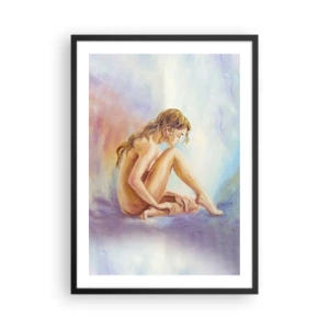 Poszter fehér keretben - Egy nő, aki gondolataiba merülve áll pasztell háttér előtt - 50x70cm - A fiatalság cselekedete - Modern fali dekoráció nappalihoz és hálószobához ARTTOR
