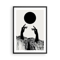 Poszter fehér keretben - Szimbolikus kezek, amelyek egy fekete labdáért nyúlnak a sziklák hátterében - 50x70cm - Szürreális kompozíció: a nap és a többi - Modern fali dekoráció nappalihoz és hálószobához ARTTOR