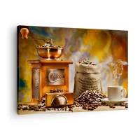 Vászonkép - Kávédaráló babbal és egy csésze kávéval a háttérben - 70x50cm - A szemek ropogása, a daráló csörgése - Modern fali dekoráció nappalihoz és hálószobához ARTTOR