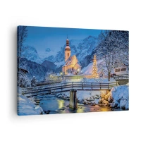 Vászonkép - Téli táj templommal, híddal és hegyekkel alkonyatkor - 70x50cm - Karácsonyi hangulat - Modern fali dekoráció nappalihoz és hálószobához ARTTOR