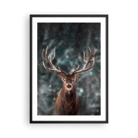 Poszter fehér keretben - Lenyűgöző agancsú szarvas portréja a téli erdő hátterében. - 50x70cm - Az erdő királya koronázva - Modern fali dekoráció nappalihoz és hálószobához ARTTOR