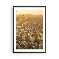 Poszter fehér keretben - Egy gyapotföld a lenyugvó nap meleg fényében - 50x70cm - Puha mező - Modern fali dekoráció nappalihoz és hálószobához ARTTOR
