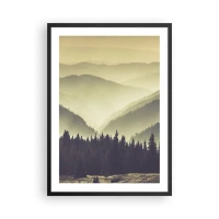 Poszter fehér keretben - Ködös panoráma hegyekre és erdőre - 50x70cm - Hegyeken túl… - Modern fali dekoráció nappalihoz és hálószobához ARTTOR