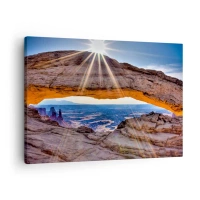 Vászonkép - A kanyonra néző sziklaív napfelkeltekor - 70x50cm - A sziklakapun át - Modern fali dekoráció nappalihoz és hálószobához ARTTOR