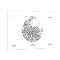 Üveg kép - Doha grafikus térképe fekete-fehér minimalista stílusban. - 70x50cm - Doha anatómiája - Modern fali dekoráció nappalihoz és hálószobához ARTTOR