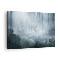 Vászonkép - Egy szarvas egy sűrű erdőben, reggeli ködbe burkolózva - 70x50cm - Reggeli birtokellenőrzés - Modern fali dekoráció nappalihoz és hálószobához ARTTOR