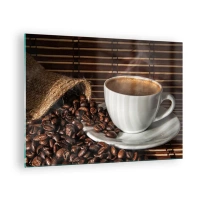 Üveg kép - Egy csésze kávé babbal rusztikus háttérrel - 70x50cm - A szén feketesége, a borostyán tisztasága - Modern fali dekoráció nappalihoz és hálószobához ARTTOR