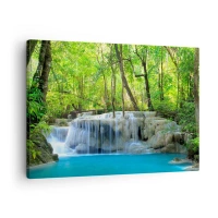 Vászonkép - Vízesés zöld fák között, kék vízzel, természetes környezetben - 70x50cm - Türkizbe és zöldbe merülni - Modern fali dekoráció nappalihoz és hálószobához ARTTOR