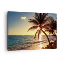 Vászonkép - Trópusi naplemente egy pálmafás tengerparton - 70x50cm - Nyár a pálmafák alatt - Modern fali dekoráció nappalihoz és hálószobához ARTTOR