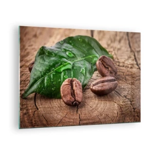 Üveg kép - Kávébabok levélen és fa háttéren - 70x50cm - A legigazibb és fekete - Modern fali dekoráció nappalihoz és hálószobához ARTTOR