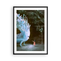 Poszter fehér keretben - Egy lány az erdőben egy varázslatos lénnyel találkozik egy világító környezetben. - 50x70cm - Fantasztikus találkozás - Modern fali dekoráció nappalihoz és hálószobához ARTTOR
