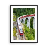 Poszter fehér keretben - Egy piros vonat egy viadukton, zöld erdővel körülvéve - 50x70cm - Vasút hegyi kilátással - Modern fali dekoráció nappalihoz és hálószobához ARTTOR