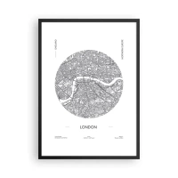 Poszter fehér keretben - London minimalista fekete-fehér térképe - 50x70cm - London anatómiája - Modern fali dekoráció nappalihoz és hálószobához ARTTOR