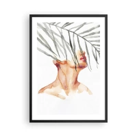 Poszter fehér keretben - Akvarell nő pálmalevelekkel, amelyek eltakarják az arcát - 50x70cm - A trópusok pulzusát érezni - Modern fali dekoráció nappalihoz és hálószobához ARTTOR