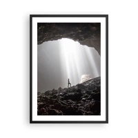 Poszter fehér keretben - Egy alak egy barlangban, fénysugarakkal megvilágítva - 50x70cm - A fényes barlang - Modern fali dekoráció nappalihoz és hálószobához ARTTOR