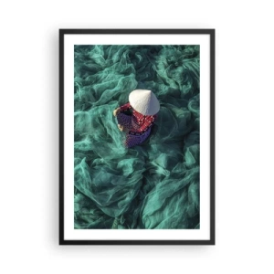 Poszter fehér keretben - Egy kalapot viselő személy zöld halászhálók között - 50x70cm - A hálók tengerében - Modern fali dekoráció nappalihoz és hálószobához ARTTOR
