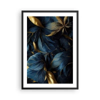 Poszter fehér keretben - Arany levelek mély sötétkék háttér előtt - 50x70cm - Arannyal bélelt - Modern fali dekoráció nappalihoz és hálószobához ARTTOR
