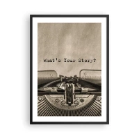 Poszter fehér keretben - Egy régi írógép, amelyre a „Mi a történeted?” felirat van írva. - 50x70cm - Meséld el - Modern fali dekoráció nappalihoz és hálószobához ARTTOR