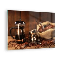 Üveg kép - Kávéfőző, csészék és egy zacskó kávébab - 70x50cm - A kávé varázsa - aroma és íz - Modern fali dekoráció nappalihoz és hálószobához ARTTOR