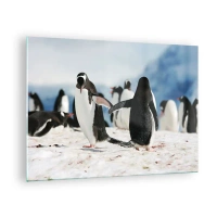 Üveg kép - Pingvinek a hóban, sarki tájon - 70x50cm - Tánc a havon - Modern fali dekoráció nappalihoz és hálószobához ARTTOR