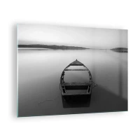 Üveg kép - Egy régi hajó a víz nyugodt felszínén, fekete-fehérben - 70x50cm - Vágyódás és melankólia - Modern fali dekoráció nappalihoz és hálószobához ARTTOR
