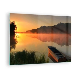 Üveg kép - Napfelkelte egy nyugodt tó felett, egy csónakkal a parton - 70x50cm - Napkelte a víz felett, mint egy tükör - Modern fali dekoráció nappalihoz és hálószobához ARTTOR