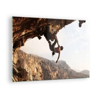 Üveg kép - Függőleges sziklára mászás hegyi tájban - 70x50cm - A világ egy szikladarabon összezsugorodott egy kézben - Modern fali dekoráció nappalihoz és hálószobához ARTTOR