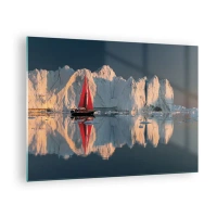 Üveg kép - Egy piros vitorlás vitorlás a jéghegyek közelében naplementekor - 70x50cm - A világ peremén - Modern fali dekoráció nappalihoz és hálószobához ARTTOR