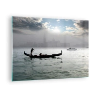 Üveg kép - Gondola Velence vizén egy ködös reggelen - 70x50cm - Egy mesés város vízből és ködből - Modern fali dekoráció nappalihoz és hálószobához ARTTOR
