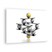 Üveg kép - Geometrikus kompozíció golyókkal és platformokkal fehér alapon - 70x50cm - Arany-ezüst egyensúly - Modern fali dekoráció nappalihoz és hálószobához ARTTOR