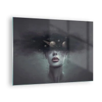 Üveg kép - Egy nő, akinek bolygók a feje egy szürreális kompozícióban - 70x50cm - És a bolygók megvadulnak... - Modern fali dekoráció nappalihoz és hálószobához ARTTOR