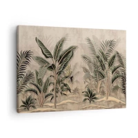 Vászonkép - Pálmafák és trópusi növényzet zöld árnyalatokban bézs alapon - 70x50cm - Gyarmati stílusú metszet - Modern fali dekoráció nappalihoz és hálószobához ARTTOR