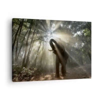 Vászonkép - Egy elefánt az erdőben, fénysugarakkal körülvéve a reggeli ködben. - 70x50cm - A szerencsecsillag alatt - Modern fali dekoráció nappalihoz és hálószobához ARTTOR