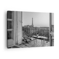 Vászonkép - Kilátás az Eiffel-toronyra a nyugágyakkal és asztallal ellátott erkélyről - 70x50cm - Párizsi délután - Modern fali dekoráció nappalihoz és hálószobához ARTTOR