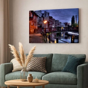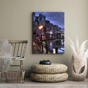A bérházak és a csatorna felett átívelő híd esti látképe egy olyan dekoráció, amely elegancia, nosztalgia és béke hangulatát hozza a belső térbe. Ez a vászonkép elmélkedésre ösztönöz és egyedi hangulatot teremt.