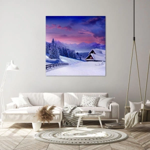 - Festői téli táj, mely hófödte hegyi házikókat ábrázol, fákkal körülvéve, a lenyugvó nap fényében. Tökéletes dekoráció a természet és a téli tájak szerelmeseinek.