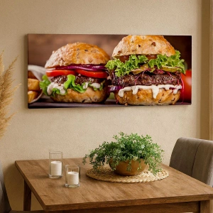 - Ez a festmény étvágygerjesztő hamburgereket ábrázol zöldségekkel és szósszal rusztikus háttér előtt. Tökéletes az ételek szerelmeseinek, ízletes hangulatot kölcsönöz a konyhának vagy az étkezőnek.