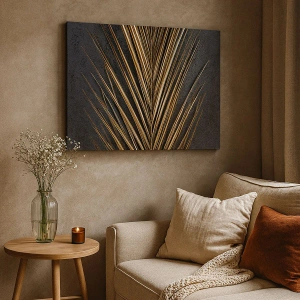 - Egy modern festmény, amely egy aranyló trópusi levelet ábrázol fekete háttér előtt. A minimalista dizájn eleganciát és luxust visz bármilyen enteriőrbe. Ideális választás stílusos belsőépítészethez.