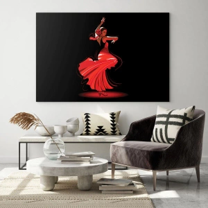 Üveg kép - Flamenco táncos piros ruhában, fekete háttér előtt - 70x50cm - A flamenco tüzes szelleme - Modern fali dekoráció nappalihoz és hálószobához ARTTOR