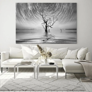 - Egy fekete-fehér tájkép, amely egy magányos fát ábrázol a vízen, csillagok gyűrűje alatt. Egy hangulatos kompozíció, tele harmóniával és minimalista szépséggel.