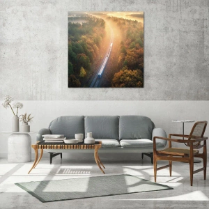 Az üvegre nyomtatás precíz részleteket biztosít, kiemelve a táj minden elemét: leveleket, vonatot és vasúti síneket. Ez életre kelti a festményt, megragadva a környező természetben való békés utazás lényegét.