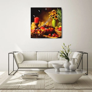 A "Csendélet kenyérrel és gyümölccsel" egy stílusos falióra, amely a természet harmóniáját és otthonos melegséget hoz az enteriőrbe. A festmény egy különféle gyümölcsökkel, például almával, körtével és szőlővel teli kosarat ábrázol, amelyet kenyér és egy élénk színű napraforgókkal teli váza vesz körül. Ez a meleg és harmonikus kompozíció rusztikus bájt kölcsönöz a belső térnek.